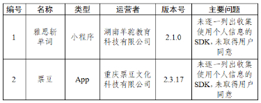 二、雅思斩单词、票豆等2款App未逐一列出收集使用个人信息的SDK,未取得用户同意(详见下表)。